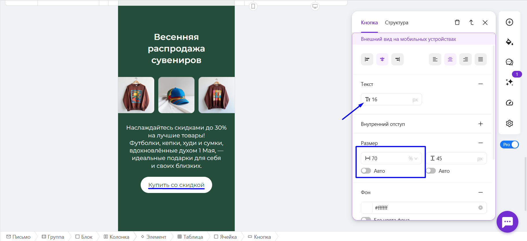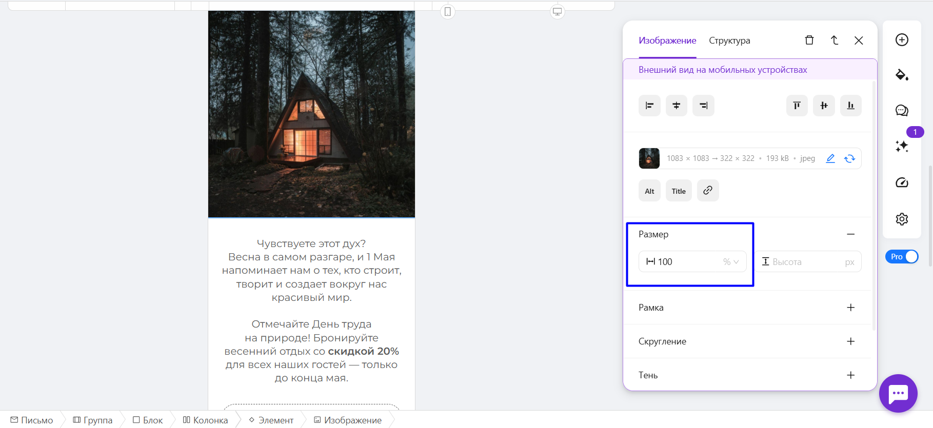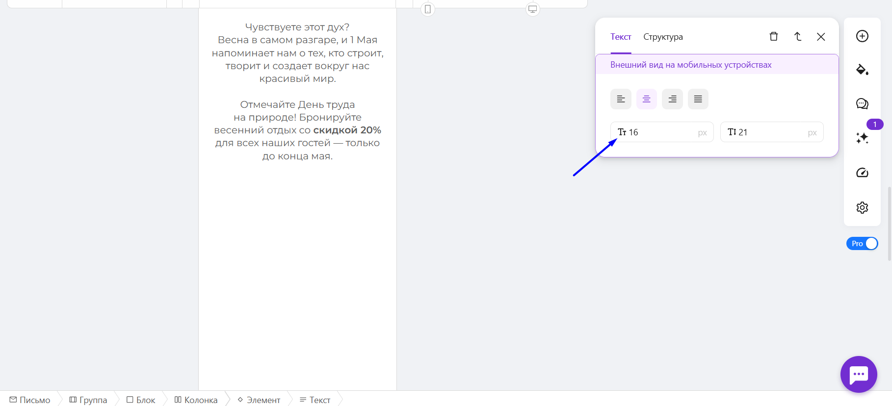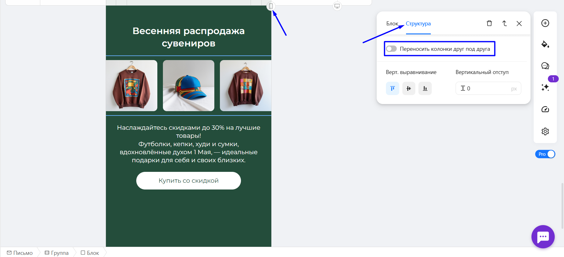 Для этого кликните на блок с несколькими колонками (в мобильной версии письма), а затем на боковой панели перейдите в раздел «Структура», там будет настройка «Переносить колонки друг под друга».